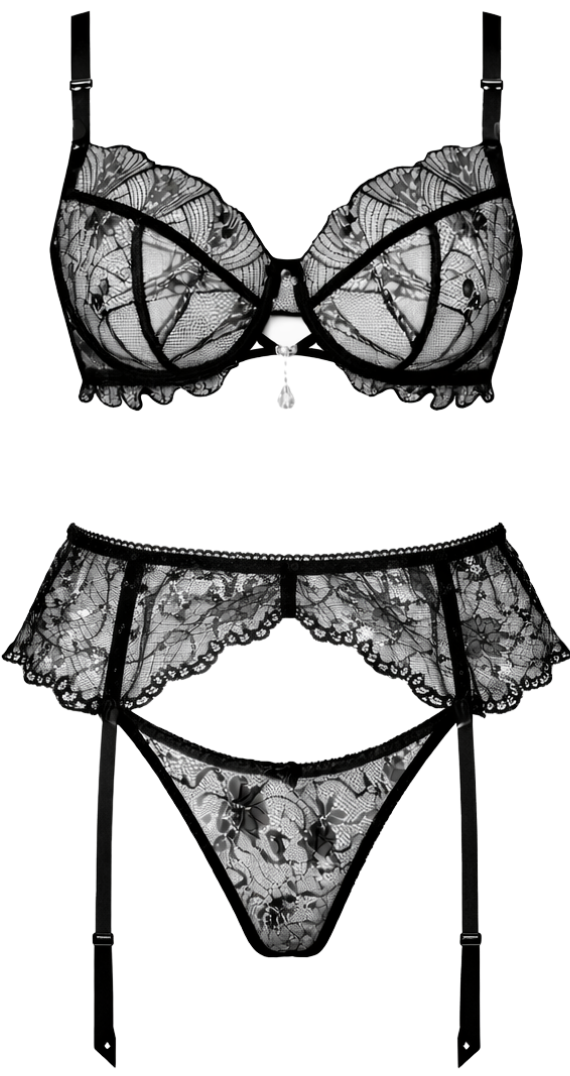 Each month, you receive an exclusive four-piece lingerie set, designed to feel chic, intentional, and timeless. Every set includes a bra, thong, garter belt, and leg garters, created as a complete look that feels elevated yet wearable.