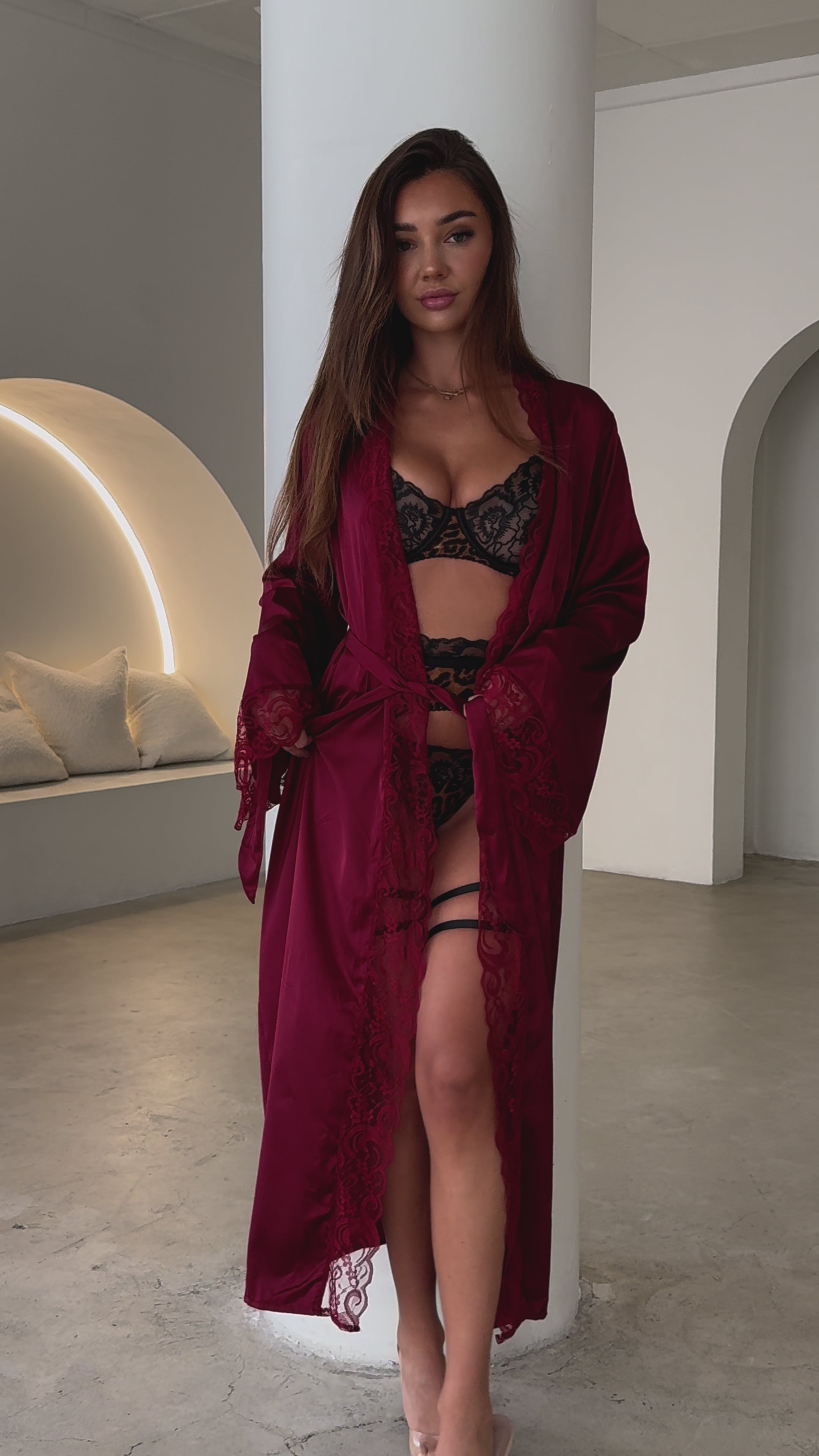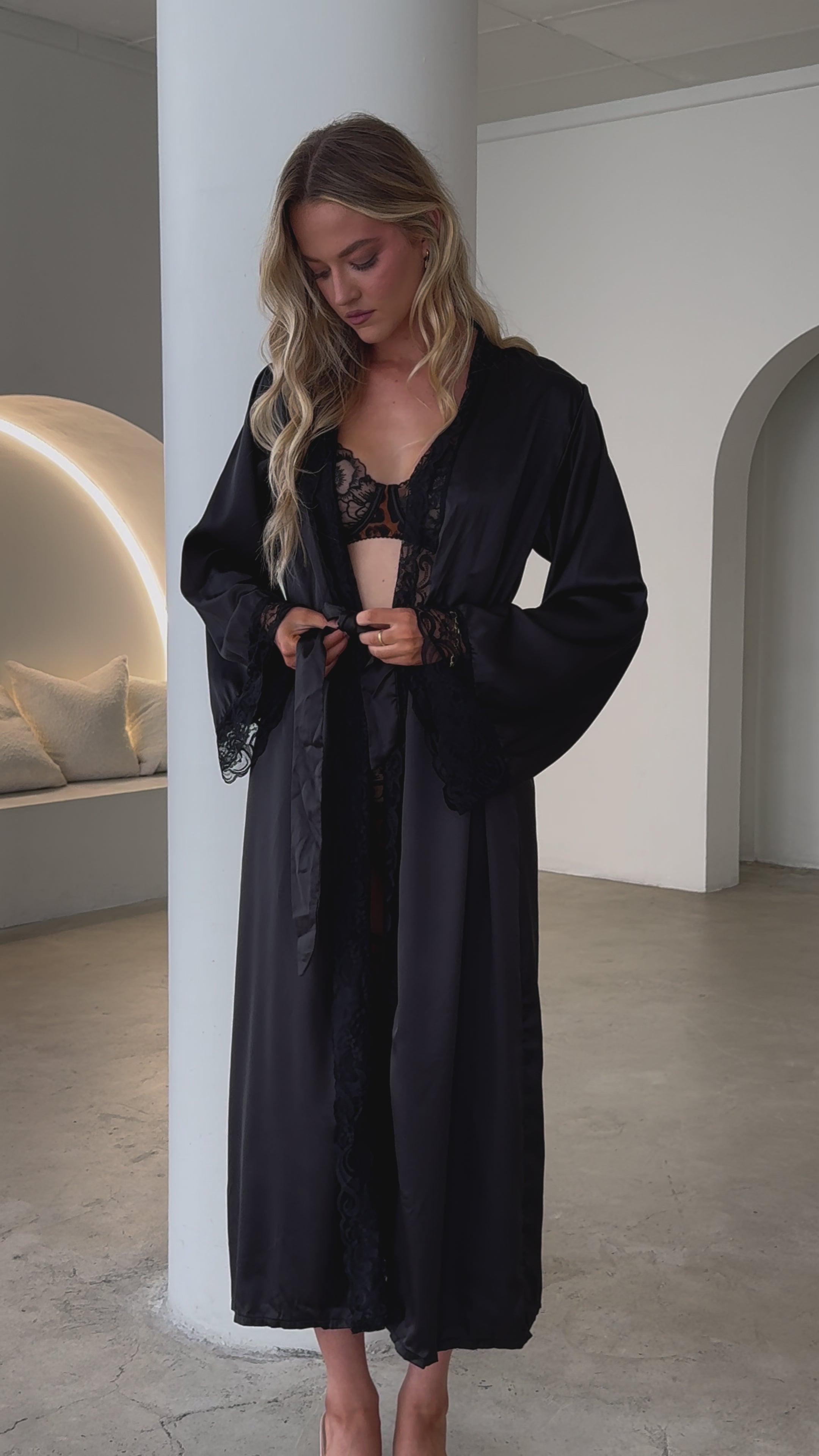 With a relaxed fit and a soft, silky feel, it drapes beautifully over the body. The full-length cut and wide sleeves create an effortlessly elegant silhouette, while delicate lace trim along the cuffs and neckline adds a romantic touch. The tie waist lets you wear it loose or wrapped up, or layered over lingerie.